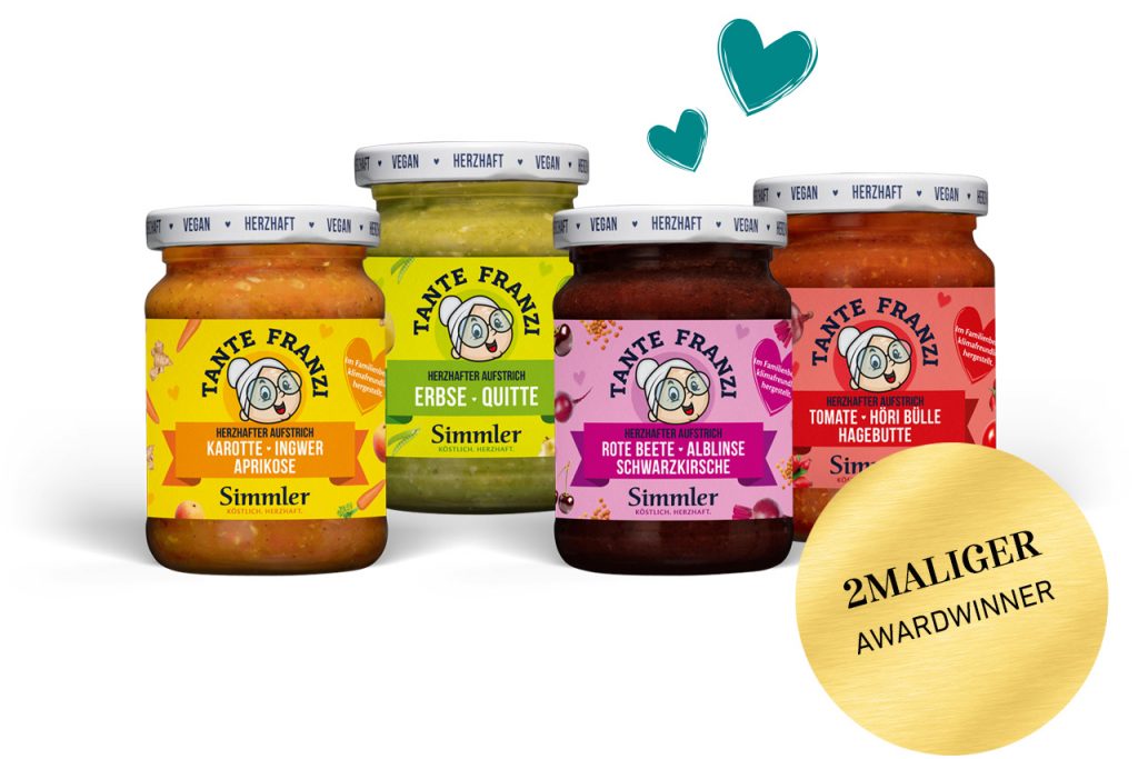 Unsere Empfehlung für unseren Neukunden Simmler: Der fruchtig-herzhafte Aufstrich, eine feine Kombination aus Frucht und Gemüse, erhält eine eigene Marke „Tante Franzi“, ergänzend zur Dach- und Unternehmensmarke Simmler. Im Fokus der Strategie stehen sowohl Simmler-Bestandskunden als auch potenzielle Neukunden, zum Beispiel Millennials, ethische Ästheten, Ernährungsbewusste und Vegetarier. Wichtiger Aspekt: Der herzhafte Aufstrich bietet die Chance, ganz neue Verwendungsanlässe zu schaffen! Er schmeckt zum Frühstück, aber auch zu jeder anderen Tageszeit. Und wo wir schon bei Tante Franzi sind: Sie ist das nette, einnehmende Gesicht der neuen Marke, erdacht, kreiert und ins Leben gerufen von unserer Agentur. So geht professionelle Markenerweiterung mit hohen Sympathiewerten!