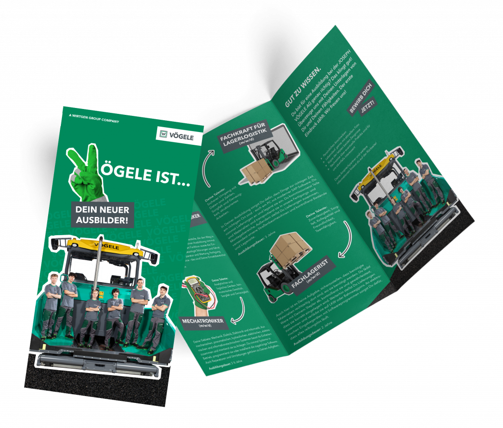 Auch die kleinen Maßnahmen können große Wirkung zeigen. Deshalb wurde ein breite Auswahl an VÖGELE-Werbemitteln- kreativ und ungewöhnlich – vom Anglerhut bis hin zum Fruchtgummi entwickelt. Nicht einfach als Give Away, sondern auf die verschiedenen Bewerberzielgruppen und die Intensität der Gespräche angepasst. Und auch der Ausbildungsflyer darf nicht fehlen. Denn trotz der hohen Smartphone Nutzung bei der jungen Zielgruppen – am Ende trägt jeder gern die wichtigsten Fakten kompakt zusammengefasst zur finalen Entscheidungsfindung mit nach Hause.